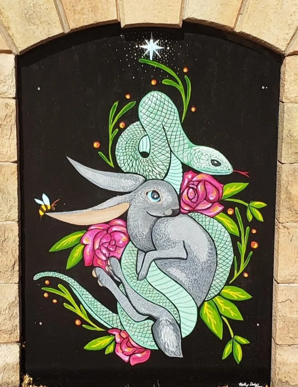 Rabbits and snakes represent rebirth and transformation, while the bee traditionally symbolizes luck and power. This piece is a reminder that even in the most seemingly dire circumstances, there is always hope to be found.