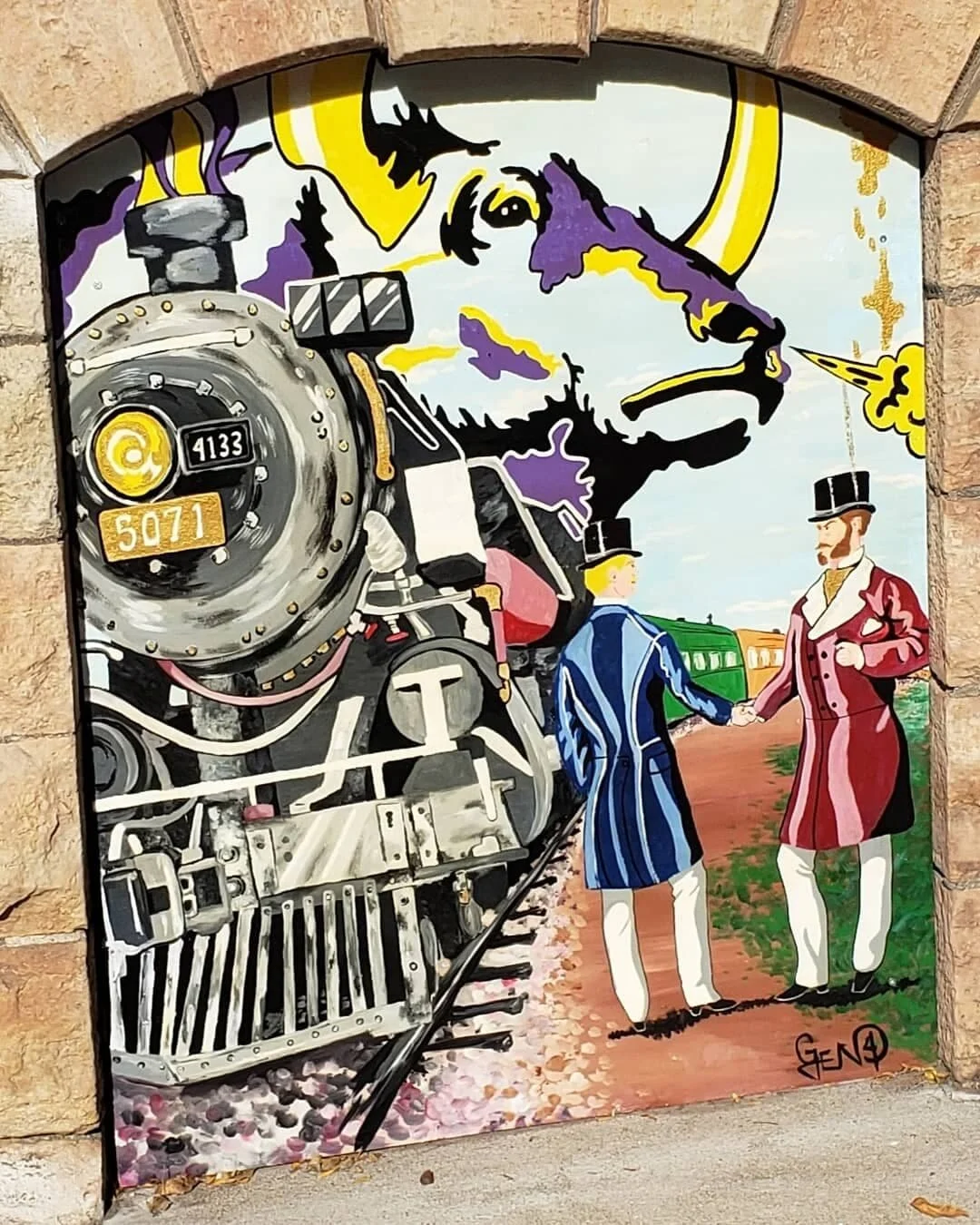 It is said that in 1852 Parson King Johnson was the first man to settle in Mankato. Years later in 1868 the first train arrived in Mankato by the Minnesota Valley Railroad. The city which once had a population of about 5,500 now has over 50,000 people residing in it. For the purpose of celebrating the spirit of Mankato’s culture and its community in this art piece, Geno created a depiction of the journey of Mankato from its beginning to what it is now. His creation merges one important component of Mankato’s culture and its school spirit with those earlier landmarks.